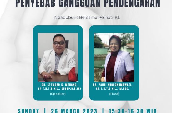 Topik 1/4 "Penyebab Gangguan Pendengaran" Pembicara dr. Steward K. Mengko, Sp.T.H.T.B.K.L., Subsp. B.E. (K); Host dr. Yanti Nurrokhmawati, M.Kes., Sp.T.H.T.B.K.L.; Tayang IG Live 26 Maret 2023 @perhatiklpusat https://youtu.be/9lwf8mwVJAc